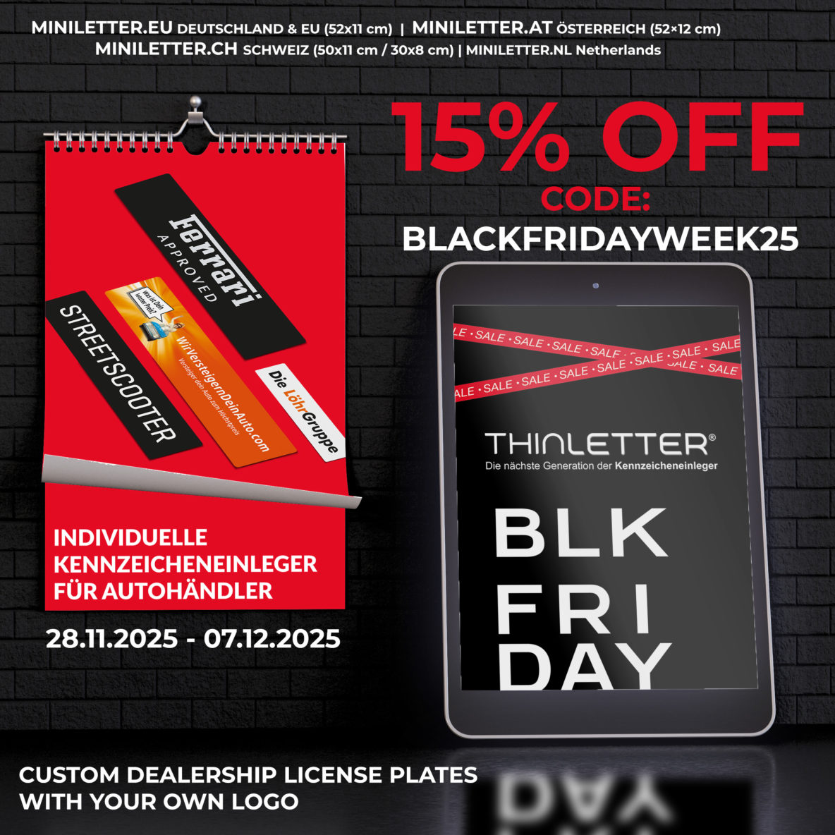 Sichern Sie sich jetzt die Black Friday Kontrollschilder Pakete und profitieren Sie von hochwertigen Werbemitteln für Ihr Autohaus. Nutzen Sie dabei den Code BLACKFRIDAYWEEK25 im Warenkorb und sichern Sie sich einen Direktabzug von 15% auf alles – der Schlüssel zu Ihrem maximalen Erfolg! Seien Sie bereit, Ihr Business auf ein neues Level zu heben, und setzen Sie auf beeindruckende Kontrollschilder für maximale Aufmerksamkeit. 🚗💨 #BlackFriday2025 #MaximalSparen #KontrollschilderSpecials